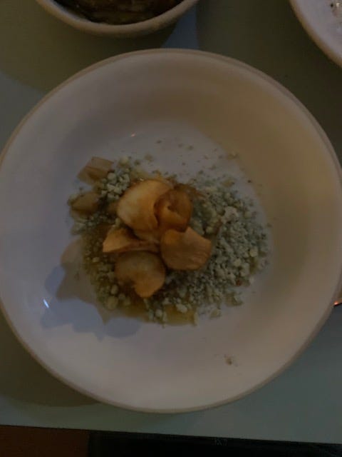 Grilled pear, blue cheese, hazelnuts, Jerusalem artichokes £16