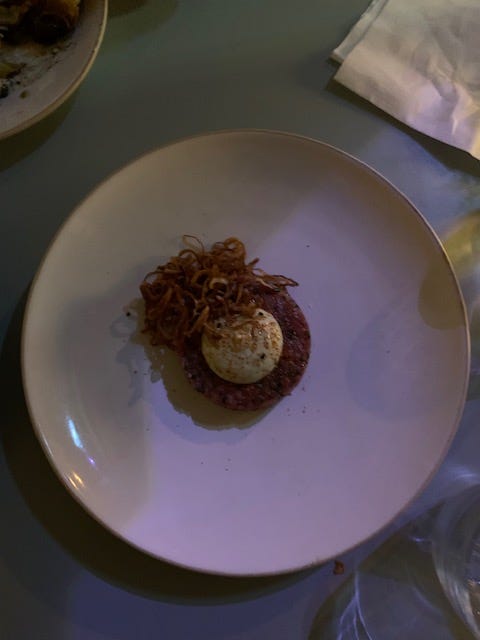 There wasn’t a dud on the menu. Maybe the raw beef. I first had this in the Soho Brasserie around thirty years ago just for the novelty value (and the expense account) and being young, quipped to my friend at the time that they’d forgotten to cook my burger. Yes, I was very funny in my youth. I don’t eat much meat these days and tbh it was my friend, who is a chef, who ate most of it and felt the mix of herbs and spices wasn’t quite how she would have prepped it. My nibble tasted fine. Each to their own I guess.